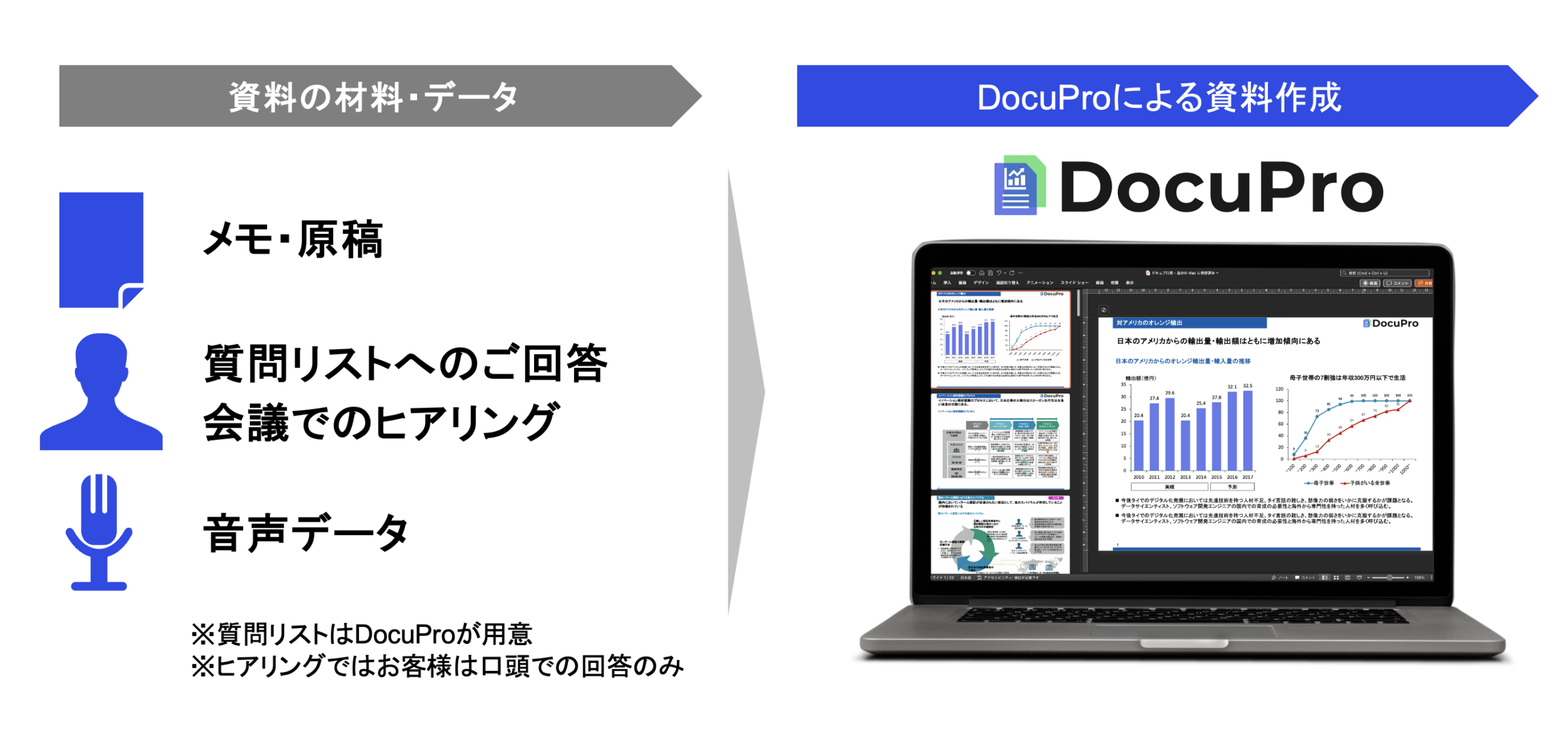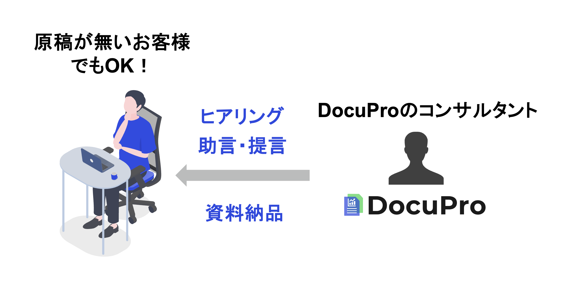 DocuProは原稿が無くても、経営コンサルが必要な情報をヒアリングし、ゼロから資料作成を行うサービスです。