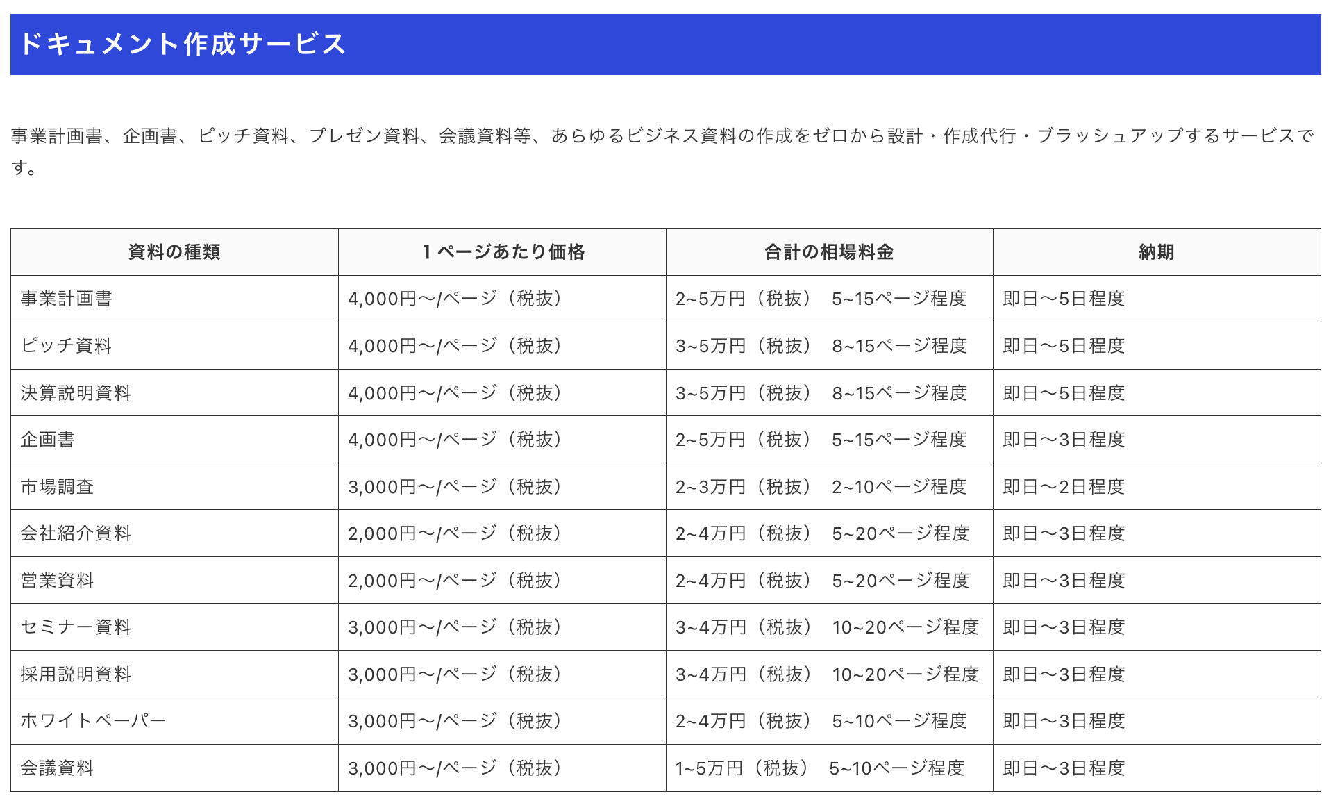 | 企画書 | 4,000円〜/ページ(税抜) | 2~5万円(税抜) 5~15ページ程度 | 即日〜3日程度 |